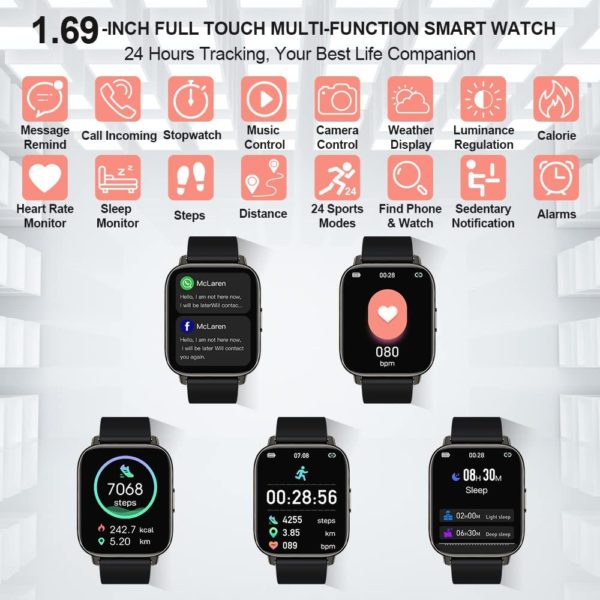 Smart Watch for Men Women 2021, 1.69” HD Touch Screen Fitness Tracker Smartwatch for Android iOS, Fitness Watches Sleep Heart Rate Monitor, IP68 Waterproof Pedometer Activity Tracker 24 Sports Modes