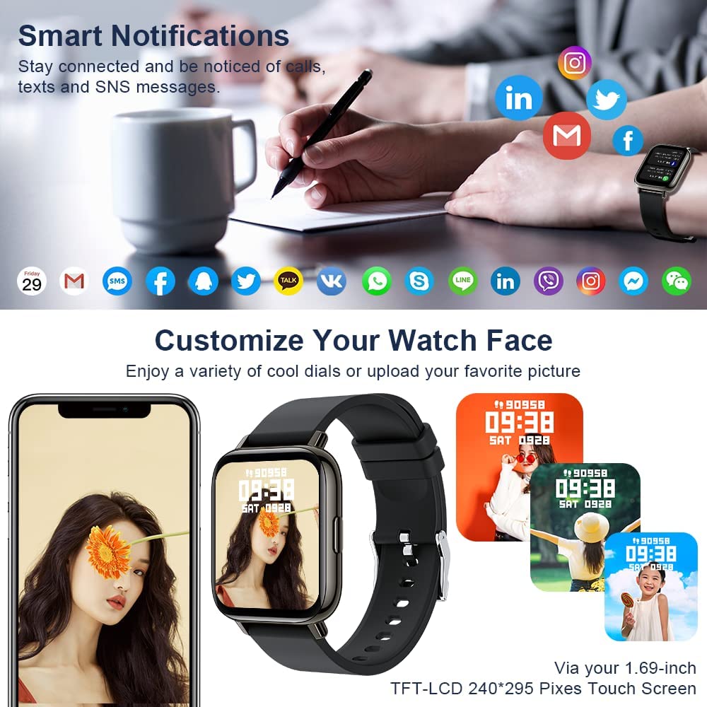 Smart Watch for Men Women 2021, 1.69” HD Touch Screen Fitness Tracker Smartwatch for Android iOS, Fitness Watches Sleep Heart Rate Monitor, IP68 Waterproof Pedometer Activity Tracker 24 Sports Modes